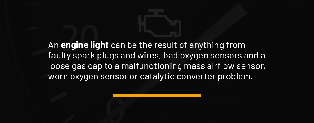 The check engine light is one of the most common cautions aside from the typical fuel light. While some dashboard notices relate to a single problem, the engine indicator can be a sign of several issues. An engine light can be the result of anything from faulty spark plugs and wires, bad oxygen sensors and a loose gas cap to a malfunctioning mass airflow sensor, worn oxygen sensor or catalytic converter problem.