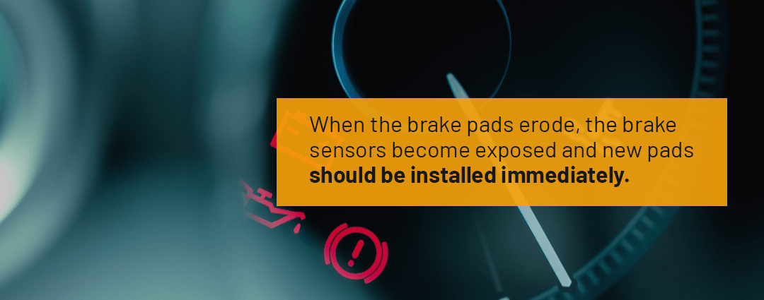 The more serious reason you may see the brake light on is if the car’s brake pads are worn. When the brake pads erode, the brake sensors become exposed and new pads should be installed immediately.