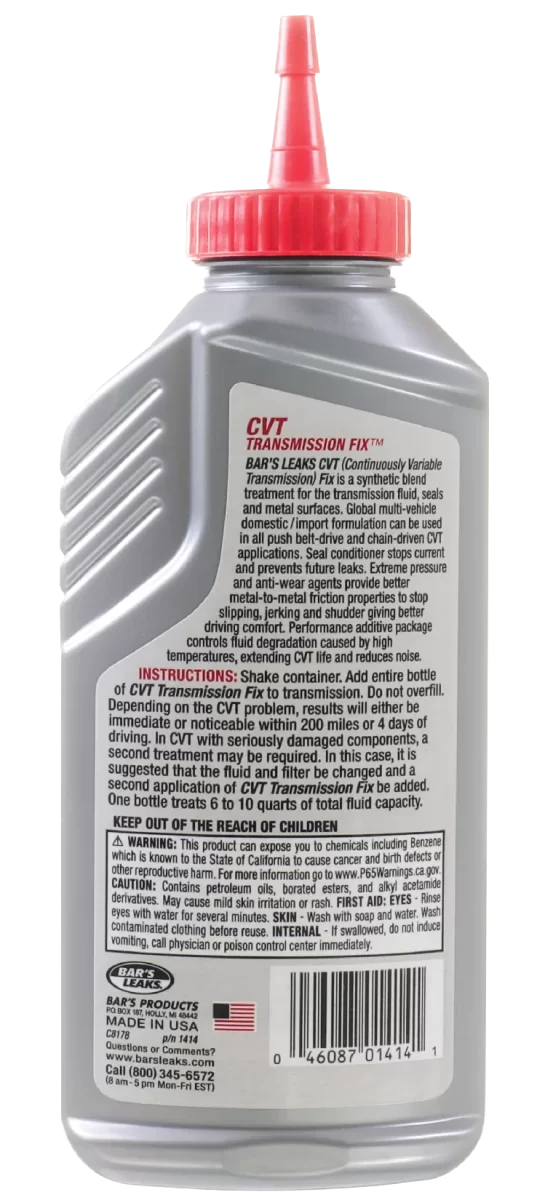 The good news is that we have a solution that can help you keep that car on the road and give your CVT a new lease on life. Introducing Bar’s Leaks CVT Transmission Fix – a product that spent over a year in development in our lab to specifically address CVT transmissions issues such as leaks, stalling, slipping and hesitation. This is not a regular transmission formula that’s been modified for CVTs – this is formula specifically engineered for CVTs and the problems they encounter.