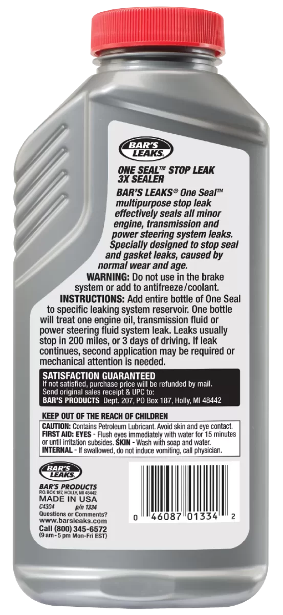 This is it: the one-stop product that does it all. Bar’s Leaks One Seal™ Stop Leak effectively seals all minor engine oil, transmission and power steering system leaks. This is your ticket to finally take care of the puddles dripping under your car without an expensive trip to the dealer or mechanic. This formula is engineered to stop seal and gasket leaks caused by normal wear and age, and it works with all engine oil, transmission fluid and power steering fluids. It’s also fully compatible with diesel and turbocharged engines.
