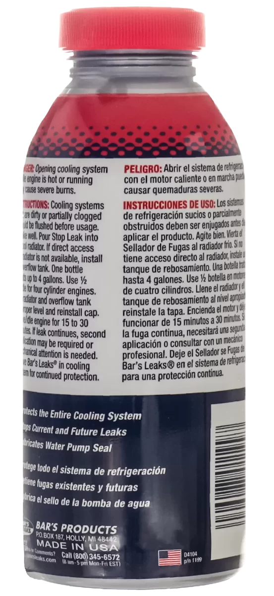 Bar’s Leaks® Original Cooling System Radiator Stop Leak seals internal, external, and coolant-to-oil leaks. Works safely and effectively on plastic, aluminum and metal radiators, heater cores, blocks, heads, gaskets and freeze plugs. Compatible with both conventional silicate-based and extended life (OAT/HOAT) antifreeze, all types and colors. Can also be used in straight water. Pre-dissolved for easy installation. Also lubricates water pump seal to protect against potential future problems.